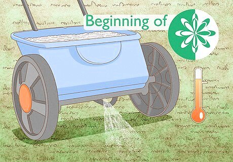 Fertilize at the right time of year. In order to your fertilizer to work best, you'll need to time it so that you fertilize at the beginning of the growing season. This is different for different types of grasses. Fertilize warm season grasses when the grass begins to turn green at the beginning of spring. Fertilize the lawn again just after the hottest part of the summer is over. Fertilize cool season grasses after the heat of the summer is over, since their growing season gets under way in early fall. You can use a Winterizer fertilizer toward the end of the summer to protect the grass over the fall and winter. Fertilize again early in the spring, making sure the fertilizer is timed to be used up before the hot summer weather begins.