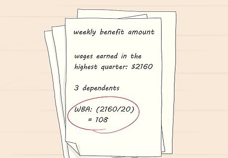 Find your weekly benefit amount (WBA). Your WBA is the maximum amount of benefits you'll get in unemployment each week, provided it is below the weekly limit. Find the amount of wages you earned in the highest quarter during your base period. Then divide that amount by one of the following numbers to get your WBA: 23 if you have no dependents (up to $481) 22 if you have 1 dependent (up to $500) 21 if you have 2 dependents (up to $518) 20 if you have 3 dependents (up to $545) 19 if you have 4 dependents (up to $591)