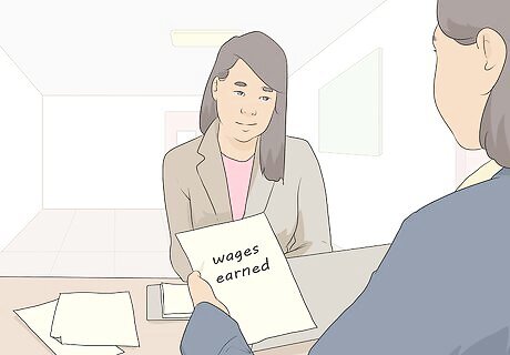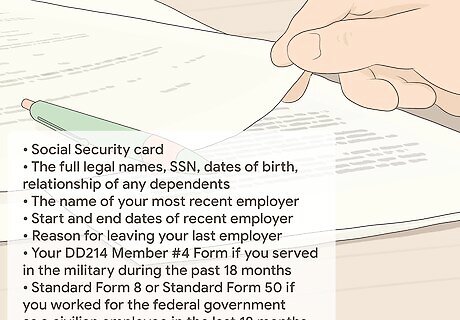 Gather necessary documents to support your application. The claim form requires you to provide details about your employers and your wages for the past 18 months. To make this process easier, keep the following information handy: Your Social Security card The full legal names, Social Security numbers, dates of birth, and relationship of any dependents The name of your most recent employer as it appears on your pay stubs or W-2 forms Your start and end dates with your most recent employer Your reason for leaving your last employer Your DD214 Member #4 Form if you served in the military during the past 18 months Standard Form 8 or Standard Form 50 if you worked for the federal government as a civilian employee in the last 18 months