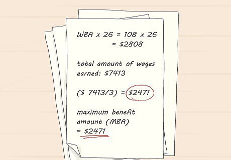 Use your WBA to figure your maximum benefit amount (MBA). Once you've determined your WBA, you can figure out the maximum amount of unemployment benefits you're entitled to for a given benefit year. The benefit year is a one-year period that starts on the date you file your initial claim. Multiply your WBA by 26. Then, take the total amount of wages you earned for your base period and divide it by 3. Whichever of these amounts is less is your MBA. If you lost your job because your employer permanently closed the location where you worked, you may get a higher MBA. Multiply your WBA by 39, then divide your total base period wages by 2. Whichever amount is less is your MBA.Tip: As long as you continue to be eligible, weekly benefits will be paid to you until your MBA is reached or the benefit year ends.