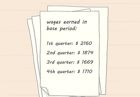 Total your wages for the base period. To be eligible for unemployment benefits, you must have been paid wages for at least 2 of the 4 quarters in your base period. Gather income information for all employers you worked for during that period. Get a total for the wages earned during the entire base period, as well as a total for each month. Your total wages earned for the entire base period must be at least 1.25 times the wages in the highest quarter of that base period. Through July 4, 2020, you must have wages of at least $1,660 in one quarter and at least $830 in a different quarter. These amounts are adjusted each year for inflation.
