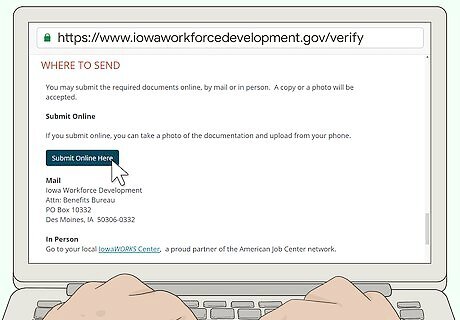 Verify your identity. If you apply online, you'll go through an identity verification process that is built into the system. However, if you apply in person, you'll need to bring a copy of your Social Security card plus a valid government-issued photo ID for identification purposes. If, for some reason, you don't pass the identity verification process online, you'll still have to bring these documents into the nearest IowaWorks Center before your initial claim will be processed. If you don't have a Social Security card, you'll need to bring a document with your Social Security number on it, such as an old tax return or a W-2 Form, plus two additional forms of identification. For example, you could bring a copy of your tax returns, your driver's license, and your passport. If you have a smartphone, you can take a photo of your documents from your phone and submit those photos online at https://www.iowaworkforcedevelopment.gov/verify.