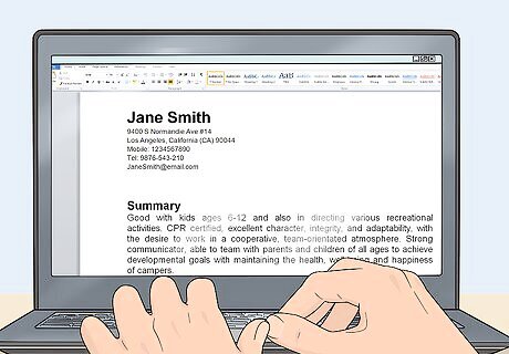 Prepare a great resume. Employers want to hire someone who is qualified for the job, so put down positions at camps and other organizations where you have previously worked. Try to keep your listings to the past 2-3 years. Be sure to note any special skills or certifications that you have (i.e, CPR training). Keep keywords in mind when writing your resume. Terms like “good with kids” and “CPR certified” may stick out more to a summer camp that’s looking to hire. Consider using a program like Microsoft Word to create your resume. This makes it easy to have a digital or print copy on hand, if necessary. If you want to use something other than Word, there are websites that offer different resume templates to choose from. Some people choose to use a website to display their resume. Sites like WordPress can do this, but they may make it more difficult for you to print out a hard copy of your resume.