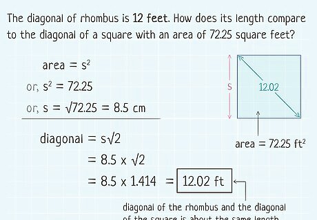 Compare two diagonals. The diagonal of rhombus is 12 feet (3.7 m). How does its length compare to the diagonal of a square with an area of 72.25 square feet? Find the square’s side length by using the area formula: Area = s 2 {\displaystyle {\text{Area}}=s^{2}} {\text{Area}}=s^{{2}} 72.25 = s 2 {\displaystyle 72.25=s^{2}} 72.25=s^{{2}} 72.25 = s 2 {\displaystyle {\sqrt {72.25}}={\sqrt {s^{2}}}} {\sqrt {72.25}}={\sqrt {s^{{2}}}} 8.5 = s {\displaystyle 8.5=s} 8.5=s Plug the side length into the formula Diagonal = s 2 {\displaystyle {\text{Diagonal}}=s{\sqrt {2}}} {\text{Diagonal}}=s{\sqrt {2}}: Diagonal = 8.5 2 {\displaystyle {\text{Diagonal}}=8.5{\sqrt {2}}} {\text{Diagonal}}=8.5{\sqrt {2}} Diagonal = 8.5 ( 1.414 ) {\displaystyle {\text{Diagonal}}=8.5(1.414)} {\text{Diagonal}}=8.5(1.414) Diagonal = 12.02 {\displaystyle {\text{Diagonal}}=12.02} {\text{Diagonal}}=12.02So, the length of the square’s diagonal is about 12 feet (4 m). This means that the diagonal of the rhombus is about the same length.