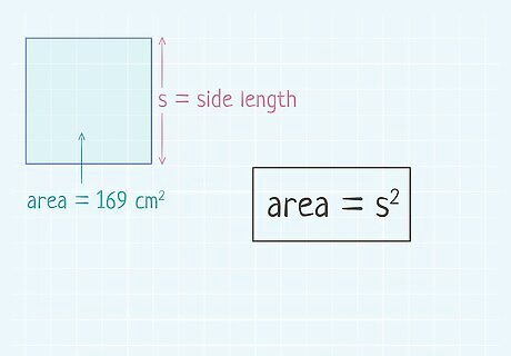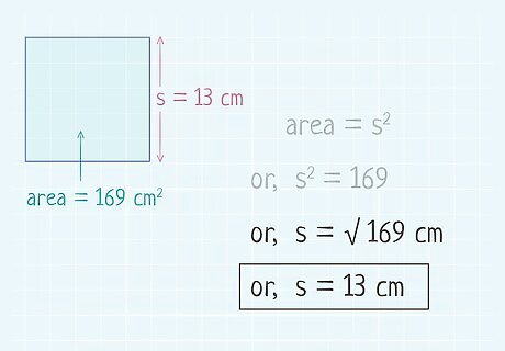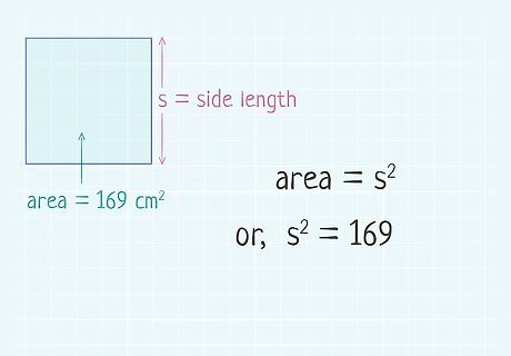 Find the square root of both sides of the equation. Taking the square root of both sides will give you the side length of the square. The easiest way to calculate a square root of a number is to use the x {\displaystyle {\sqrt {x}}} {\sqrt {x}} function on a calculator. You can also calculate a square root by hand. Remember that when finding the square root of a squared variable, the answer is simply the variable. For example: 169 = s 2 {\displaystyle 169=s^{2}} 169=s^{{2}} 169 = s 2 {\displaystyle {\sqrt {169}}={\sqrt {s^{2}}}} {\sqrt {169}}={\sqrt {s^{{2}}}} 13 = s {\displaystyle 13=s} 13=sSo, a square with an area of 169 square centimeters has a side length of 13 cm.