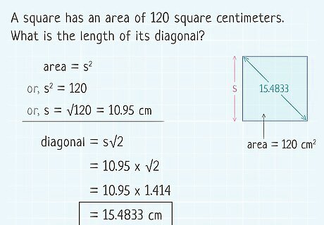 Try this problem. A square has an area of 120 square centimeters. What is the length of its diagonal? Find the side length of the square by using the formula Area = s 2 {\displaystyle {\text{Area}}=s^{2}} {\text{Area}}=s^{{2}}: 120 = s 2 {\displaystyle 120=s^{2}} 120=s^{{2}} 120 = s 2 {\displaystyle {\sqrt {120}}={\sqrt {s^{2}}}} {\sqrt {120}}={\sqrt {s^{{2}}}} 10.95 = s {\displaystyle 10.95=s} 10.95=s Plug the side length into the formula Diagonal = s 2 {\displaystyle {\text{Diagonal}}=s{\sqrt {2}}} {\text{Diagonal}}=s{\sqrt {2}}: Diagonal = 10.95 2 {\displaystyle {\text{Diagonal}}=10.95{\sqrt {2}}} {\text{Diagonal}}=10.95{\sqrt {2}} Diagonal = 10.95 ( 1.414 ) {\displaystyle {\text{Diagonal}}=10.95(1.414)} {\text{Diagonal}}=10.95(1.414) Diagonal = 15.4833 {\displaystyle {\text{Diagonal}}=15.4833} {\text{Diagonal}}=15.4833So, the length of the diagonal is about 15.5 cm.