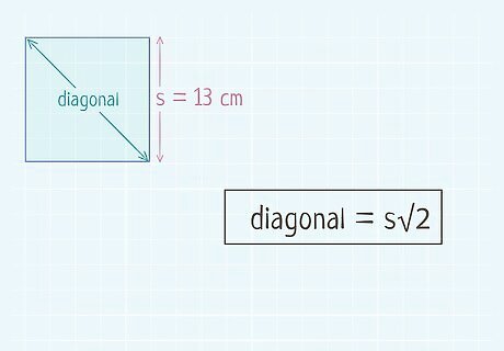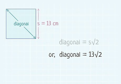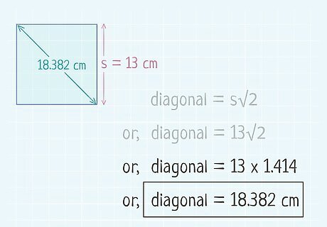 Plug the side length into the formula. Substitute for the variable s {\displaystyle s} s. You should have calculated the side length previously. For example, if you found that the side length of a square is 13 centimeter (5.1 in), your equation will look like this: Diagonal = 13 2 {\displaystyle {\text{Diagonal}}=13{\sqrt {2}}} {\text{Diagonal}}=13{\sqrt {2}}