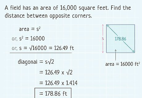 Find the distance between opposite corners. The corners are at the northwest and southeast corners of a square field. The field has an area of 16,000 square feet. The distance between opposite corners of a square is the length of the diagonal. So first find the side length using the area formula: Area = s 2 {\displaystyle {\text{Area}}=s^{2}} {\text{Area}}=s^{{2}} 16 , 000 = s 2 {\displaystyle 16,000=s^{2}} 16,000=s^{{2}} 16 , 000 = s 2 {\displaystyle {\sqrt {16,000}}={\sqrt {s^{2}}}} {\sqrt {16,000}}={\sqrt {s^{{2}}}} 126.49 = s {\displaystyle 126.49=s} 126.49=s Plug the side length into the formula Diagonal = s 2 {\displaystyle {\text{Diagonal}}=s{\sqrt {2}}} {\text{Diagonal}}=s{\sqrt {2}}: Diagonal = 126.49 2 {\displaystyle {\text{Diagonal}}=126.49{\sqrt {2}}} {\text{Diagonal}}=126.49{\sqrt {2}} Diagonal = 126.49 ( 1.414 ) {\displaystyle {\text{Diagonal}}=126.49(1.414)} {\text{Diagonal}}=126.49(1.414) Diagonal = 178.86 {\displaystyle {\text{Diagonal}}=178.86} {\text{Diagonal}}=178.86So, the length of the diagonal is about 179 feet.