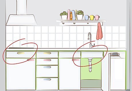 Find the spots where you’ll put the sink and cooktop. Both of these features need plenty of space. To get the most accurate estimate possible, move the worktop to the location where you’ll install it. Locate your water line for the sink and your gas or electrical lines for the cooktop or hob, as that’s where you’ll need to cut the holes. Never place these features on the joints between 2 worktop pieces.