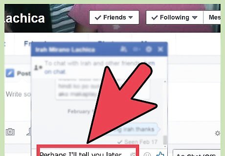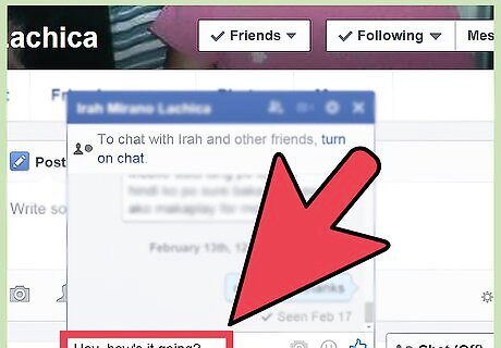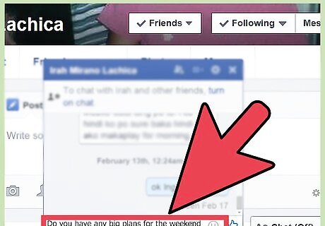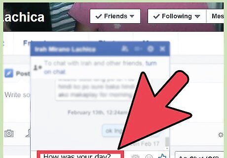 Talk about her instead of yourself. Both boys and girls enjoy talking about themselves, in real life and on Facebook. Asking questions about her not only keeps the conversation going, but allows you to learn more about your crush. If you don't know much about her, ask questions such as "What did you do this week/weekend?" "How was your day?" If you already know what she is into, ask about her hobbies. "Have you heard any new good bands recently?" "Have you read any good books lately?" "Did you see [insert movie name here]? What did you think about it?"