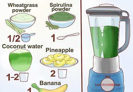 Mix wheatgrass powder into a smoothie. Purchase wheatgrass powder from a natural food store. Look for a powder that's made with wheatgrass juice instead of dried and ground wheatgrass. Your body will absorb the wheatgrass better if it's been processed already. Put the powder into a blender along with your liquids and sweeteners of choice. Blend the mixture until it's smooth. For a sweet wheatgrass drink, blend together: 1/2 scoop of wheat grass powder 2 cups (450 g) of fresh or frozen pineapple 1 frozen banana 1 to 2 cups (240 to 480 ml) of coconut water 1 teaspoon of spirulina (optional)