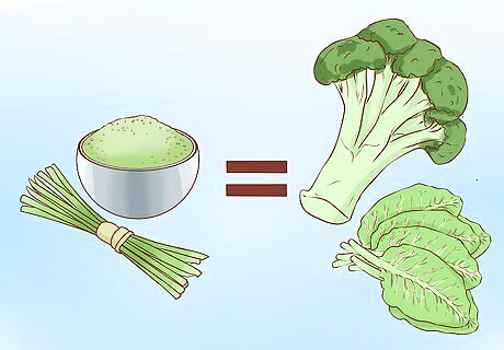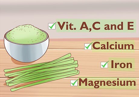 Take wheatgrass for the vitamins. It's easy to add wheatgrass to other vegetables and increase your vitamin intake. Wheatgrass is high in chlorophyll, vitamin A, vitamin C, vitamin E, iron, and other minerals. Keep in mind that wheatgrass doesn't count as one of your recommended daily vegetables. Wheatgrass also contains calcium and magnesium, which are great for building bone health.