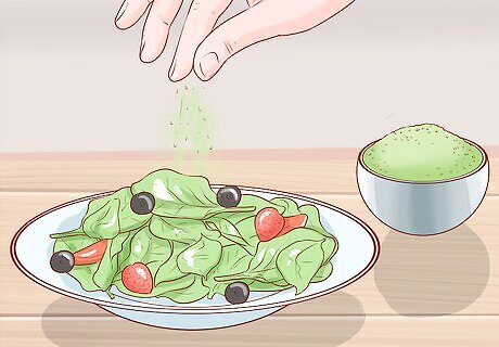 Use wheatgrass in salads. Try adding fresh wheatgrass shoots to your salad greens. Keep in mind that these may be harder to digest than the juice or powder. If you prefer, mix the wheatgrass juice into a salad dressing or sprinkle wheatgrass powder onto your salad. You can also combine the wheatgrass juice with fruit juice and oils to make a unique salad dressing.