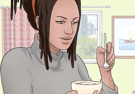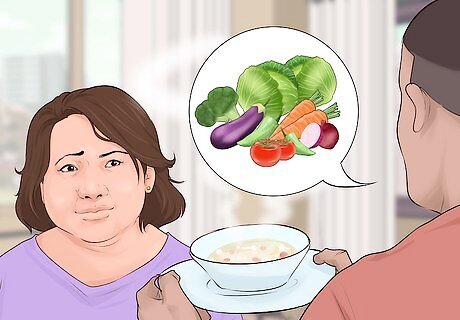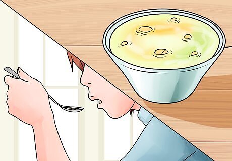 Replace solid foods with liquid foods. If you find that eating solid foods is difficult or unappetizing, start eating soups or drinking smoothies to get your calories. Try to use protein-fortified milk when cooking or mixing up beverages. To make protein-fortified milk, mix 1 quart of whole milk with 1 cup of nonfat instant dry milk. Beat the mixture until the powder dissolves, about 5 minutes. Or, try some of the following soup and smoothie suggestions: For a tangy protein smoothie: Blend ⅓ cup of cottage cheese or plain yogurt, ½ of cup vanilla ice cream, ¼ cup of prepared fruit-flavored gelatin (you can use an individual ready-to-eat snack cup), and ¼ cup of low-fat milk until they're combined. Drink immediately. For hearty soups, make sure to include beans or meat and plenty of vegetables. You might try making a turkey minestrone or chicken and white bean soup. For a high-protein milkshake: Blend 1 of cup protein-fortified milk, 2 tablespoons of butterscotch sauce, chocolate sauce, or your favorite fruit syrup or sauce, 1/2 cup of ice cream, and 1/2 teaspoon of vanilla extract till combined. Drink immediately.