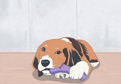 Give your dog chew toys. Chew toys, food puzzles, and/or treat-dispensing toys are a great way to distract a restless dog. Therefore, make sure to bring plenty of these along with you to keep your dog busy if it becomes restless or overwhelmed. For example, Bully Sticks, Kongs, and Adventure Boxes are great high-value treats that will keep your dog busy for at least 10 to 20 minutes. Refusing to lick or chew its favorite chew toy is a sign of nervousness. If your dog continues to show signs of anxiety, then ask the server to box up your food and leave. If your dog is protective of its toys, skip out on bringing them so it doesn't feel stressed.