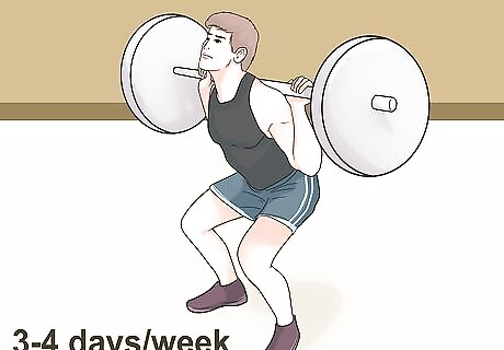 Do strength training 3-4 days a week. While speed and agility are key attributes in soccer, it’s also important to be strong. Be sure to incorporate regular muscular exercise into your routine. You can employ calisthenics like pushups, pull ups, air squats and lunges, or lift weights if you have access to a gym. Try to do some form of resistance exercise every other day. Bodyweight exercises can be performed almost anywhere, which means you won’t need to rely on any specialized equipment. When lifting weights, keep the intensity high and number of repetitions low to build strength.