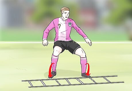 Train with the agility ladder. Stretch out the agility ladder on a flat patch of ground, then run from one end to the other using different footwork patterns. Make sure you only set your feet down in the open spaces between the rungs. The agility ladder calls for precise foot placement and increased concentration, which will both come in handy during a scrimmage. For example, you could span the ladder by shuffling sideways, skip every other rung or use alternating steps and leaps like in hopscotch. Run rounds on the agility ladder in between other drills and exercises.