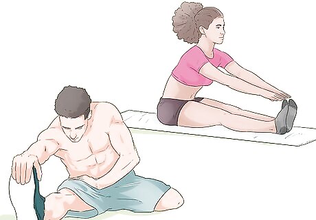 Stretch out your muscles. Go through a full-body stretching session. Begin with the legs, hips and ankles, but don’t forget to also limber up your back, shoulders, wrists and neck. Stretching improves your mobility and makes sprains and strains less likely. It's very easy to pull something if you haven’t stretched enough. Hold the stretch in the deepest range of motion you can for several seconds. The quadriceps and hamstrings are the two biggest muscles in the leg and should receive the most attention while stretching. Dynamic stretches, or stretching while in motion, mimic the kinds of movements found in soccer. Examples of dynamic stretches are swing kicks, side bends and toe touches.