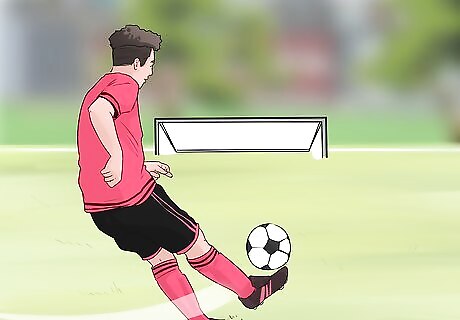 Practice penalty kicks. At the end of your workout, cool down by taking a few free shots at the goal or another target. Shoot from different angles and positions to simulate the conditions of an actual game. Kicking is one of the most fundamental skills in soccer, so there’s no substitute for old fashioned repetition. Aiming at a small target, like a goal post or a square tacked to the net, can help you refine your accuracy. Complete a minimum of 30 kicks with each leg. Learning to shoot with both legs will make you more versatile.