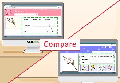 Compare different online stores before buying your flowers online. There are many different floral sites online, and they all vary in products and prices. Look at different websites and compare options before selecting which site to order from. Compare price, delivery time, and other gift options.