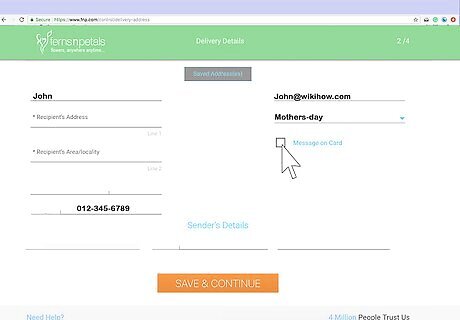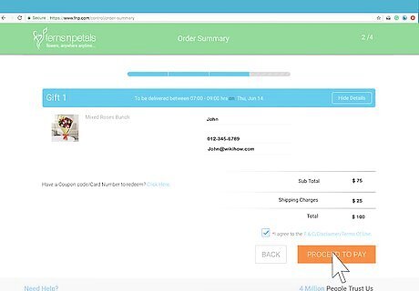 Complete your online order form if ordering flowers online. Add your flowers and additional gifts to your cart and complete your order, paying with a credit or debit card. Include the correct name, delivery address, and payment method. You will likely include a phone number to use to ensure delivery.