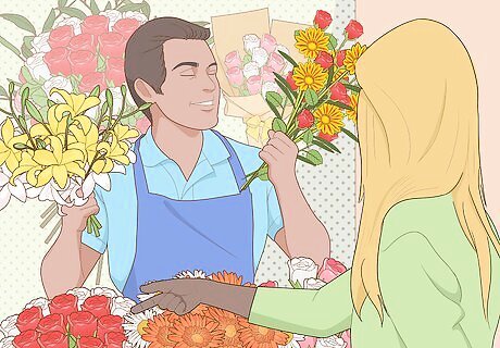 Ask a florist for help if you are stuck. If you are buying flowers in person and you are lacking inspiration, ask the florist or floral department clerk for assistance. They can generally bundle together a beautiful bouquet and offer ideas on colors, flower types, and arrangement.