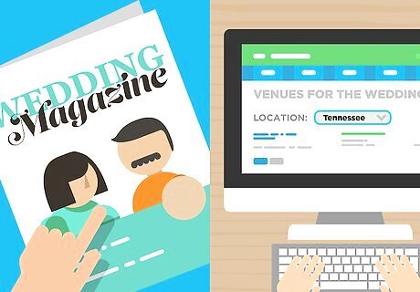 Locate and arrange a reception venue. Just as your officiant can set the tone for the ceremony, your reception site will set the stage for your celebration. If you’re not using a local wedding planner, there are many factors to consider when arranging your reception venue from number of guests to the atmosphere you want to create. Think about the type of reception you want and style of your wedding. Do you prefer something formal with a band? Or maybe you want something romantic or hip with a DJ? Knowing the atmosphere you want to create at your reception will help you more effectively locate and book your venue. Depending on where your ceremony is, you may want you reception to be at the same place. Some locations, such as hotels, will offer package deals for hosting a ceremony and reception, especially if you’ve chosen a destination wedding. Make sure your venue can accommodate all of your guests comfortably and within local zoning and fire laws. Find out if the venue is full service, which may help decrease stress and how much you have to arrange, including a caterer. There are many ways to find a reception venue in Tennessee. You can ask friends, family, or colleagues for suggestions. You may also want to search for a wedding planner yourself. One of the easiest ways is to search for a reception venue is online. Some wedding related websites offer search engines for wedding planners by location that can help you find several different options. You can also use local wedding magazines, blogs, and city guides to help you find a venue in your location.