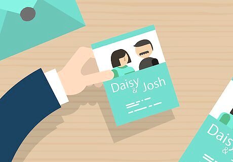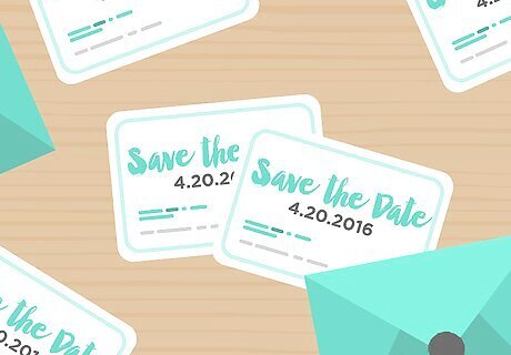 Send guests save the date cards. Six to eight months before your actual wedding, and before you send formal invitations, send your guests “save the date” cards for your wedding. This will allow guests to schedule time and save money for travel and gifts if need be. Your save the date card doesn’t have to be formal as the invitation. It should just let people know the date and location of your wedding. If you have engagement photos or simply a picture of you and your fiancé(e) that you like, you can use this on the card. Send save the date only to the people who you want to attend. Even if some people already know and have said they will come, make sure to send them save the date cards as well.