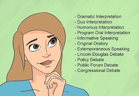 Choose your event. There are eleven nationally recognized speech categories. They are: Dramatic Interpretation, Duo Interpretation, Humorous Interpretation, Program Oral Interpretation, Informative Speaking, Original Oratory, Extemporaneous Speaking, Lincoln-Douglas Debate, Policy Debate, Public Forum Debate, and Congressional Debate. Decide which event you want to participate it. Every event shares a few general skills such as public speaking ability, but they each require their own set of talents. For example, Humorous Interpretation requires an ability to make people laugh, while Extemporaneous Speaking requires an ability to come up with original speaking content in a short amount of time. If you’re planning to do a Duo Interpretation, you’ll need to find a partner, while a Policy Debate will require you to get the debate question ahead of time. Evaluate your own strengths and weaknesses in determining which event to focus on. If you’re not sure which event you want to focus on, choose one that you think you’ll perform best in during your audition. Once you’re on the team, your coach will most likely allow you to change your event if another event appeals to you. You can find a description of each event at the National Speech & Debate Association website.
