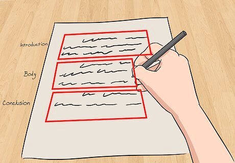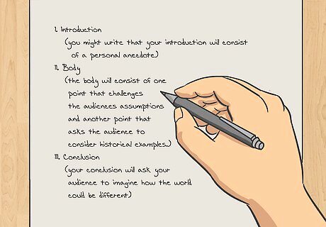 Make an outline. A good speech consists of an introduction, a body with two-to-four major points, and a conclusion. For your outline, write out a one line description of each part of your speech. For example, you might write that your introduction will consist of a personal anecdote, the body will consist of one point that challenges the audiences assumptions and another point that asks the audience to consider historical examples, and your conclusion will ask your audience to imagine how the world could be different. Your outline doesn’t need to be detailed, but it can be. Use whatever method works best for you. At the very least, write out your one-sentence summaries of each section.