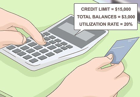 Calculate your current utilization rate. Take out all credit card statements and identify the credit limits. Add them together to get your total available credit. Then go through and add up all balances. Divide the balance amount by the available credit. For example, if your credit limit is $15,000 and your total balances are $3,000, then your utilization rate is 20% ($3,000 divided by $15,000 is 0.2).