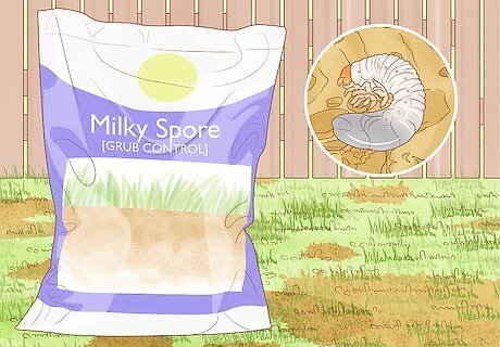 Use spores for Japanese beetle grubs. Bacillus popilliae is a bacterium that can be used to kill the larvae of Japanese beetles. Because it’s a spore, it comes in the form of a powder that you can sprinkle on your lawn to get rid of grubs. Like the worms, using Bacillus popilliae to get rid of grubs is a long-term solution, rather than a quick fix. To use Bacillus popilliae, you can spray it onto your lawn with water, or sprinkle the dry powder onto your grass. Like the beneficial nematodes, you'll have to choose between using Bacillus popilliae or chemical pesticides, because the spores won’t work without a grub population. A Japanese beetle grub can be distinguished from other grubs by the end of its body. Whereas most grub bodies end in a rounded stump, the Japanese beetle grub has a pointed end.