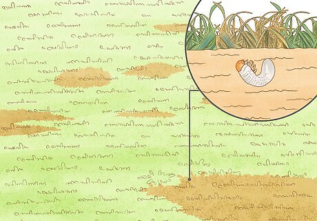 Check for grubs. When you do find evidence of grubs, the next step is to search your lawn to inspect for the larvae. To do this, find a small spade or shovel and go to one or two of the dead patches of grass. Dig up square-foot (30 cm by 30 cm) portions of lawn where the dead grass meets the green grass Dig to a depth of about two inches (five cm) Look for C-shaped bugs with legs on the inside of the body near the head If you find these larvae, it means you have grubs