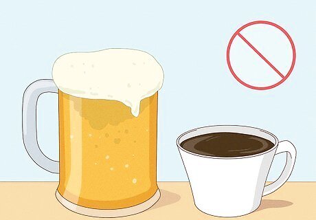 Drink less caffeine and alcohol. Many find that reducing their intake of these substances reduces the severity of cramps. In the days leading up to your period, ease up on the coffee and happy hour drinks. Try to avoid them entirely while you're actually feeling cramps. If you have severe cramps, you may want to adopt a caffeine and alcohol-free lifestyle all month long, rather than just during your period. Try replacing coffee with black tea. You'll drastically decrease your caffeine intake, but it still contains enough to give you a little morning boost.