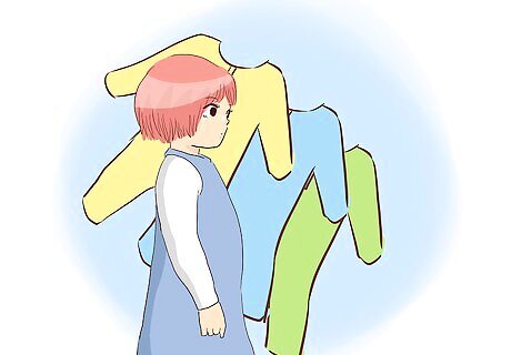 Display the clothes in your home. This is usually only done with favorite articles of baby clothing. The parents can display the clothes inside picture frames or shadow boxes and hang them in the child's room as decoration. As with storing the clothes for later use, framed baby clothes need to be clean and dry before being framed. There are many different ways to frame baby clothes. The clothing can be folded and inserted in a picture frame with only a certain portion visible. For example, a shirt can be folded the same way that men's dress shirts are packaged at stores in order to show the front of the shirt in the picture frame. Another way to frame the outgrown baby clothing is to use a shadow box. These boxes are deeper so the clothing does not get flattened. Shadow boxes can be purchased in large enough sizes to accommodate an entire outfit or several different clothing pieces together, such as 2-3 favorite tops. Since a shadow box can be heavier than a picture frame, it is important to be sure the nail or hook is very secure in the wall in order to support it.