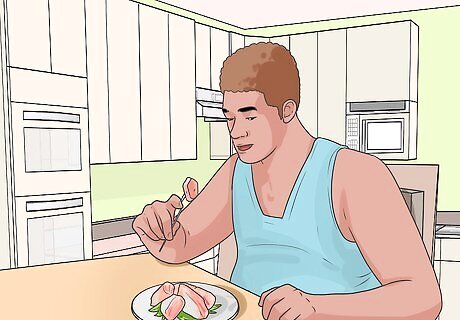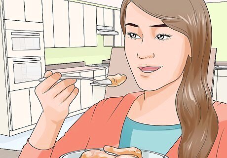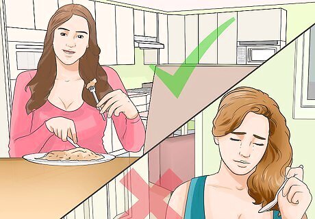 Eat according to your appetite, not your emotions. Your body will send messages to your brain to indicate when it is hungry and requires food. Focusing on your body's natural need for food, rather than your emotional desire for food, will ensure you are eating enough every day. Only eat when you are hungry and stop eating when you are satisfied. However, when you are feeling really hungry, eat until you are comfortable full but not stuffed or overly full. This will allow your digestive system to process the food and not be overwhelmed by food. Allow your stomach, rather than your emotions, to dictate how much you eat every day and when you eat. Try to do this for two weeks in a row, eating when you feel hungry, which may mean you eat at unusual times or do not eat for a period of time until you feel hunger. Then, only eat until you feel comfortably full. This will allow you to be more in touch with your body's natural eating cycle and avoid overeating or eating with your emotions.