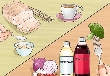 Be aware of the foods that contain the six tastes. The Ayurvedic diet focuses on creating meals around the six tastes: sweet, sour, salty, bitter, pungent, and astringent. The idea is to include all six tastes in every meal so every major food group is present on your plate and you are consuming enough nutrients. Foods that contain each of the six tastes include: Sweet: These include foods such as whole grains, dairy, meat, chicken, fish, honey, sugar, and molasses. Sour: These include foods such as cheese, yogurt, alcohol, vinegar, pickled foods, tomatoes, plums, berries, and citrus fruits. Salty: These include foods such as seaweed, salted meats, fish, soy sauce, and any food that contains added salt. Bitter: These include foods such as green vegetables (leafy greens, celery, broccoli, sprouts, spinach, kale), endives, chicory, beets, and tonic water. Pungent: These include foods such as onions, garlic, chilies, peppers, cayenne, black pepper, cloves, ginger, mustard, and salsa. Astringent: These include foods such as dried beans, lentils, green apples, cauliflower, figs, pomegranates, and tea. The six tastes are ordered in the order you should digest them at every meal. Start with sweet foods and move down to astringent foods.