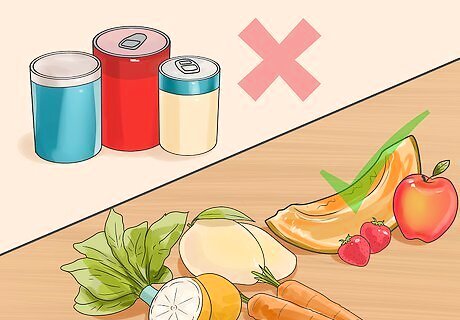Consume more fresh foods and avoid pre-packaged foods. In the Ayurvedic diet, fresh foods are associated with energy, vitality, and health, while pre-packaged foods are associated with imbalance, fatigue, and staleness. Avoid canned, frozen, and pre-packaged foods to ensure you are only consuming foods that will add to your overall health. Go shopping every day or every other day at a farmer's market for fresh fruits and vegetables. You should also minimize your consumption of leftovers and microwaved meals, as these are not considered fresh and full of energy.