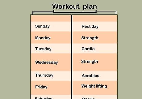 Set a specific overall workout plan for yourself. Two-week based planning is best in most cases. This allows you to adjust based on your actual progress, and also allows for deep recovery when you plateau. Professional athletes have much longer plans that should be worked out with their coaches. Some things to remember as you plan are: Don't weight lift with the same muscle group 2 days in a row. Plan at least 1 rest day in your schedule every week. Plan the time you will be working out -- you need to make it habit or you won't commit to your workout plan.