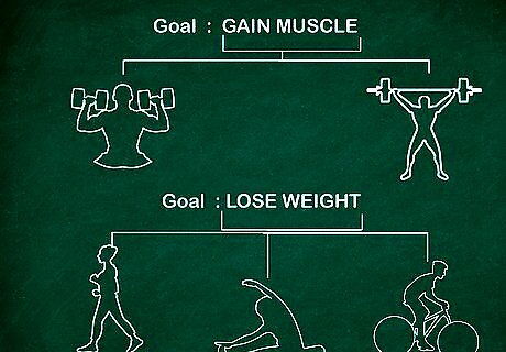 Set your goals. Physically write them out so you can refer to them when your motivation is faltering or if you just need a little boost. Why do you want to work out? What is your end goal? Those looking to gain muscle will focus on strength training and weight lifting. Those looking to lose weight should focus on aerobic (running, biking, etc.) exercises with light weight lifting.