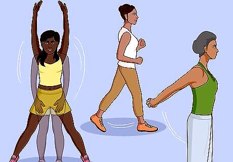 Stretch. If you don't already stretch before and after workouts, start now. And if you do, try adding a few more minutes of stretching in the middle of your day or before you go to sleep. Stretching relieves stress and tension and helps get you to relax. Try dynamic stretching to add interest to your warm-up. Dynamic stretching is a mixture of light jogging, jumps, and stretches that actively get your body moving.
