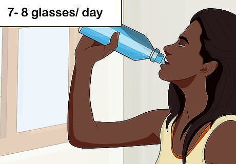 Drink throughout the day. It is easiest to stay hydrated if you are constantly drinking, and good hydration is necessary to make the most of your workouts. You should drink 7-8 glasses of water every day, and more if it is hot. Carry a water bottle with your everywhere to remind you. Drink one full glass of water right when you wake up to rehydrate you after sleeping.