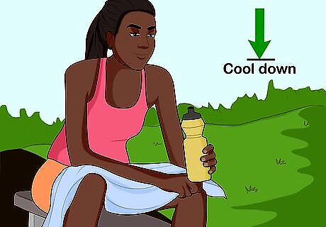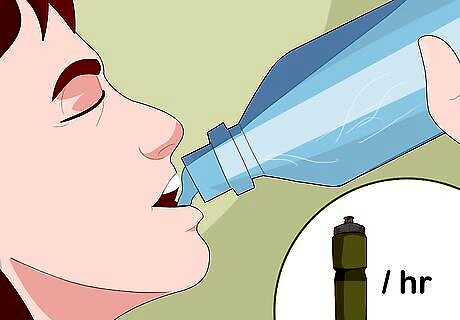 Drink at least 1 water bottle an hour. You need to be constantly hydrating to make sure your muscles are firing on all cylinders. It doesn't matter what the weather is like -- you always need to drink while exercising to get the most out of exercises. Double the amount of water you drink on hot days, as you sweat our water more quickly and can get dehydrated. If you feel thirsty, you're already dehydrated. Drink enough to stay ahead of thirst.