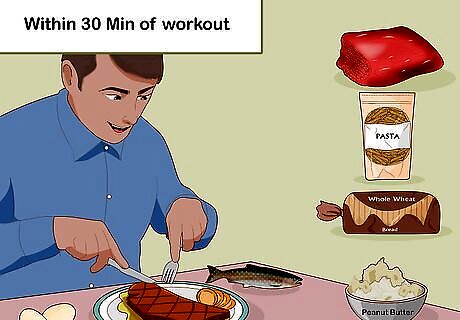 Eat a protein-filled meal within 30 minutes of working out. . If you are interested in gaining muscle mass and size, eat a source of protein (chicken, beef, eggs, fish, peanut butter) and carbs (rice, bread, potatoes, pasta) to keep your body well supplied with nutrients for growth. Eat every 2-2 1/2 hours a day. Complex carbs found in whole-wheat breads and pastas are much better for you post-workout than simple carbs like white bread and rice. If you're going for a more aerobic exercises, like running, the same principles apply. However, you will need less protein.