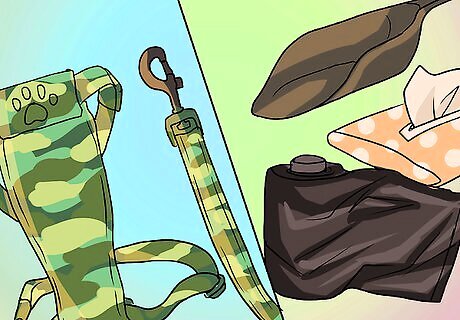 Bring a leash and harness or crate. You'll need a leash to walk your dog during rest stops, but that may not be enough to secure your dog safely during the actual travel portions of your trip. Some pet experts recommend using a travel harness/seatbelt built for dogs to prevent your pet from sliding around in the backseat or trying to climb up into your lap. Ask your vet or a qualified dog trainer what would be ideal for your dog on the road. Don't forget to bring plastic waste bags and/or a waste scoop to pick up after your pet during rest stops.