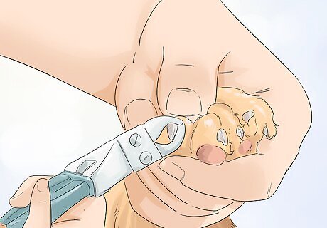 Trim your dog’s nails. While many dog owners prefer to have their pet’s nails trimmed at the groomer’s, or by a veterinarian during a routine check up, it is possible to trim your dog’s nails on your own. With your dog laying on its side, brace its paw and look for the quick, a pink vein attached to the nail bed. Using dog clippers (available at pet stores), clip the nail as much as you can without hitting the vein. Pet and praise your dog throughout the process. If you do hit the vein, stop the bleeding by dabbing the nail into a bar of soap.