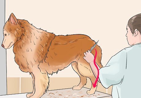 Pare down hair on the back legs. The hair on your Rough Collie’s back legs should be trimmed when overgrown for a more polished look. Have your dog lie on its side and hold its foot gently to brace the leg. Use grooming scissors to cut hair on its back leg into an arc shape.