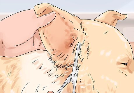 Cut away excess hair on pads. With your dog still lying on its side, grip its wrist gently but firmly between your thumb and index finger. With your free hand, cut hair growing underneath the paw until it is level with the pad of your dog’s foot. Trim all the way to the wrist.