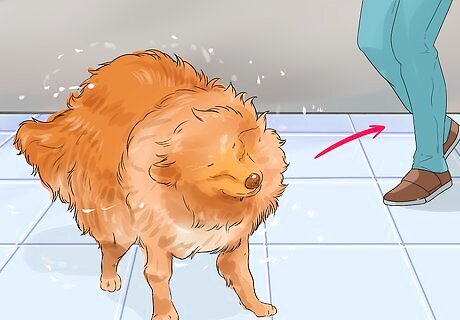 Dry your dog’s coat. Once all the shampoo is rinsed out, take a step back and let your dog shake off before drying it. Using a large towel, pat your dog down to remove excess water. Use a blow dryer on a low setting to dry your dog’s coat completely. To avoid tangles, hold the blow dryer at a distance from your dog and blow dry slowly.