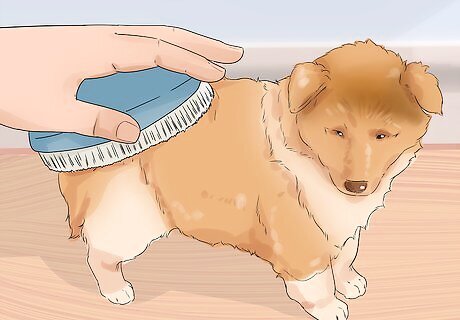 Get your puppy used to brushing. Starting to brush your puppy early (at around eight weeks old) will allow it to relax and cooperate in the future. Gently restrain the puppy with one hand and start brushing it very lightly with the pin brush to get it used to the process. Have your puppy sit or stand for brushing, either on the floor or on a raised surface like a table, and praise it for staying still.